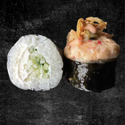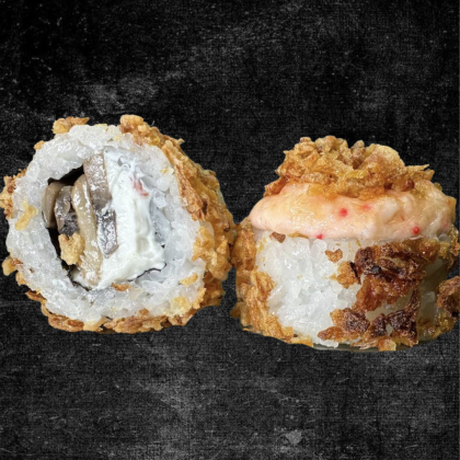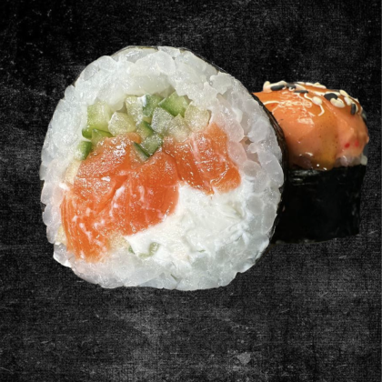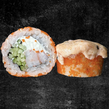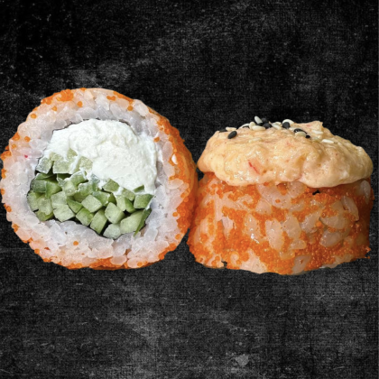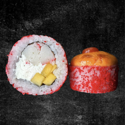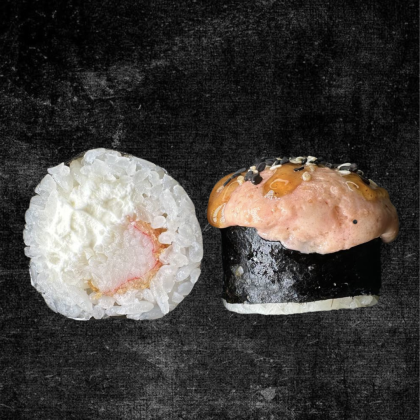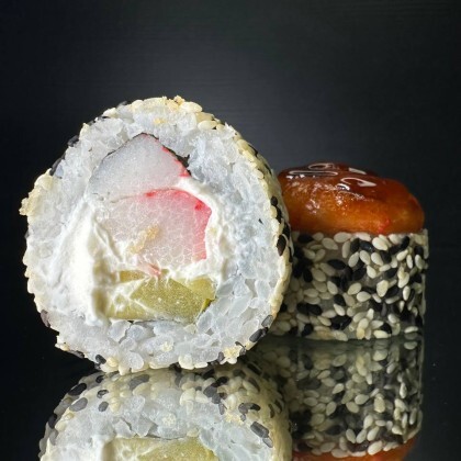 Нори, рис, сыр Креметта, мясо мидий, кунжут, болгарский перчик, соус терияки, майонез, сыр моцарелла